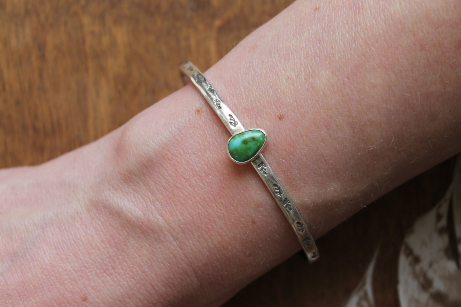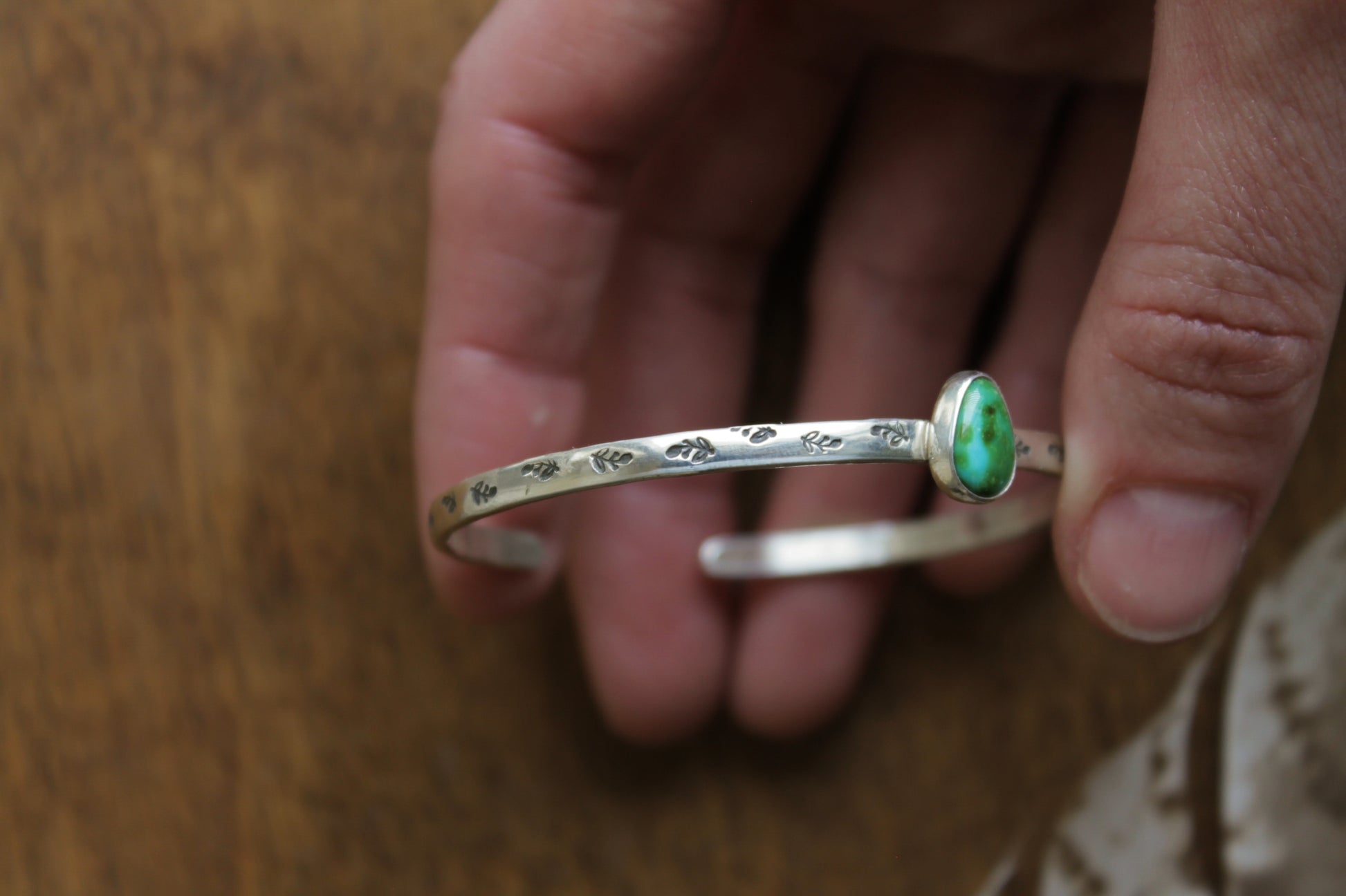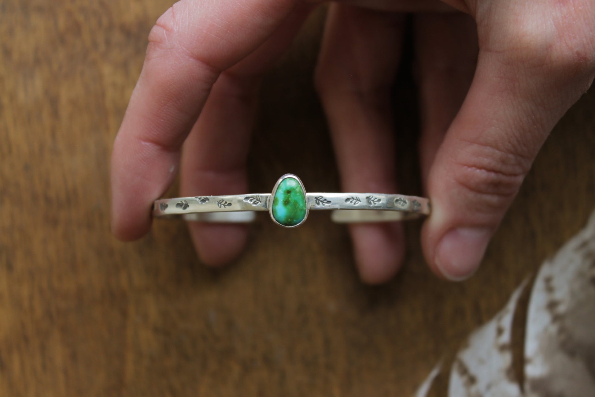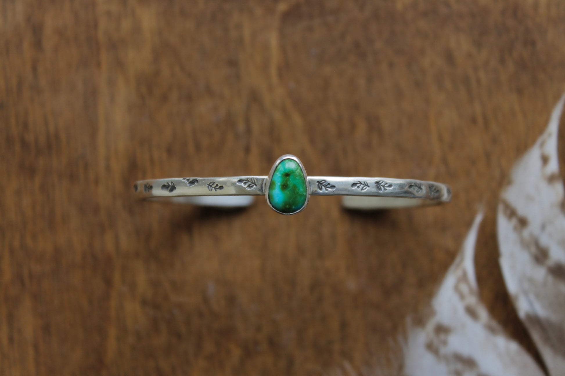 Elevate your everyday style with the timeless charm of the Turquoise Stacker Cuff. Featuring a vibrant genuine Emerald Valley turquoise gemstone, this handcrafted cuff is made from responsibly sourced and recycled sterling silver, embodying sustainability and enduring beauty.