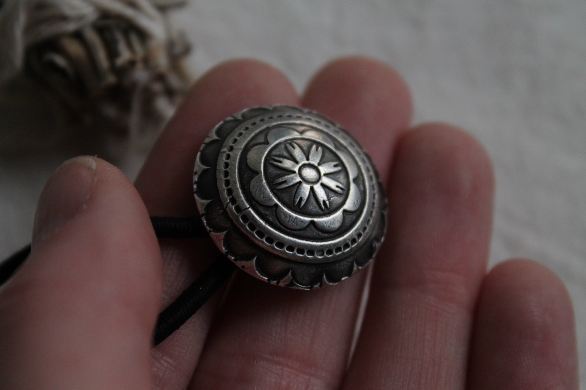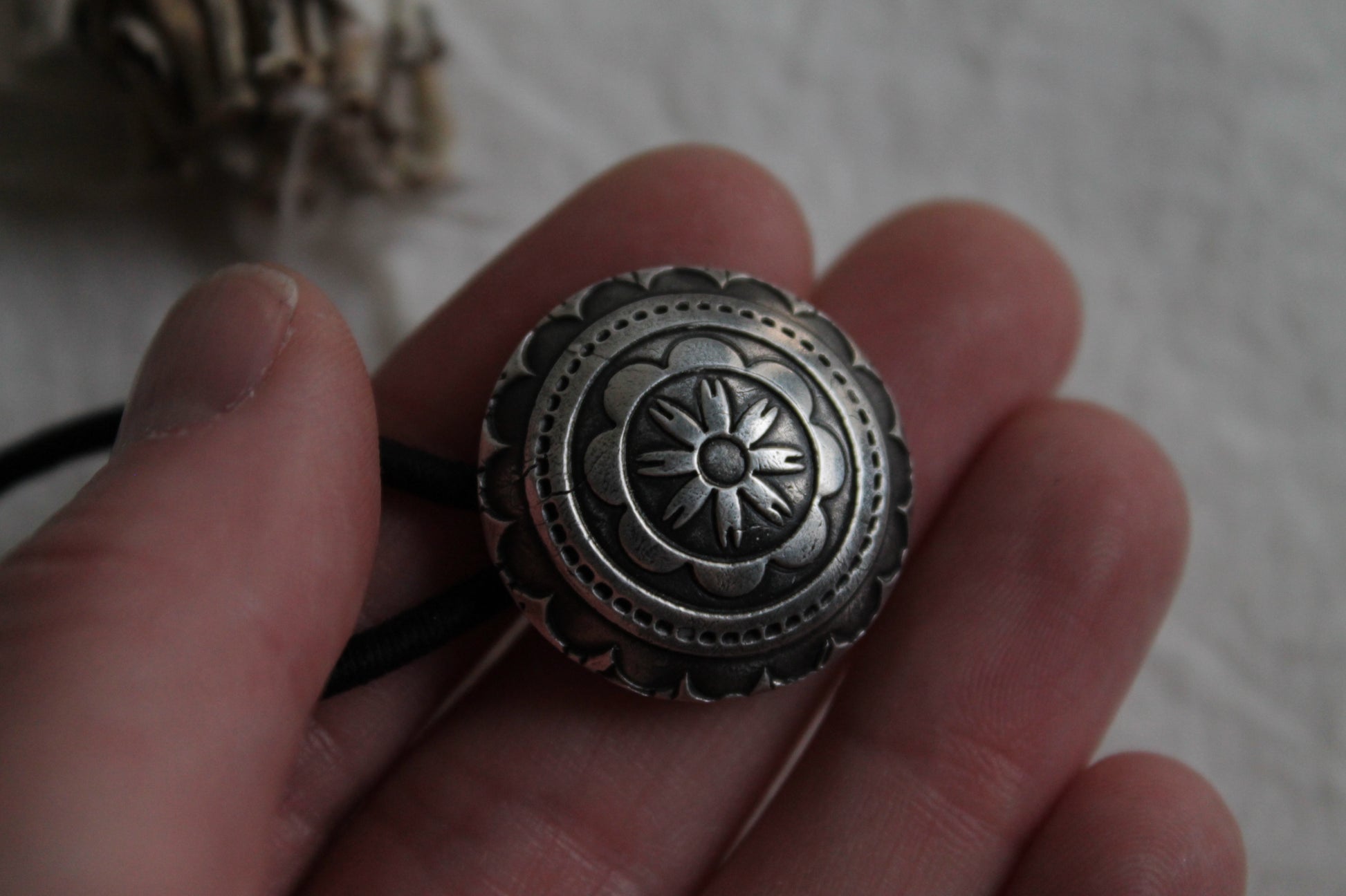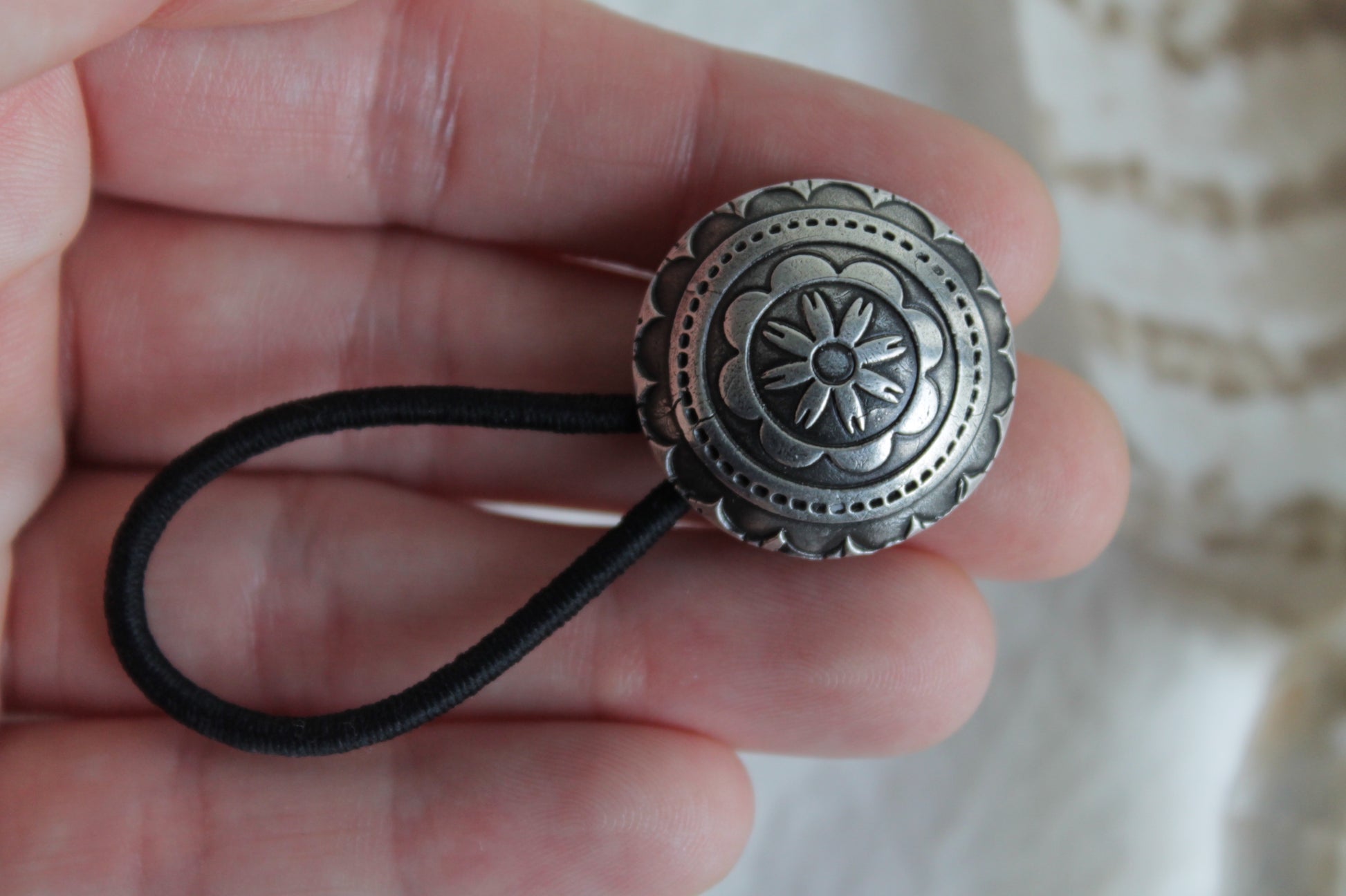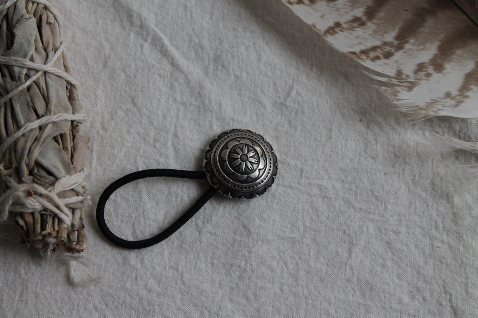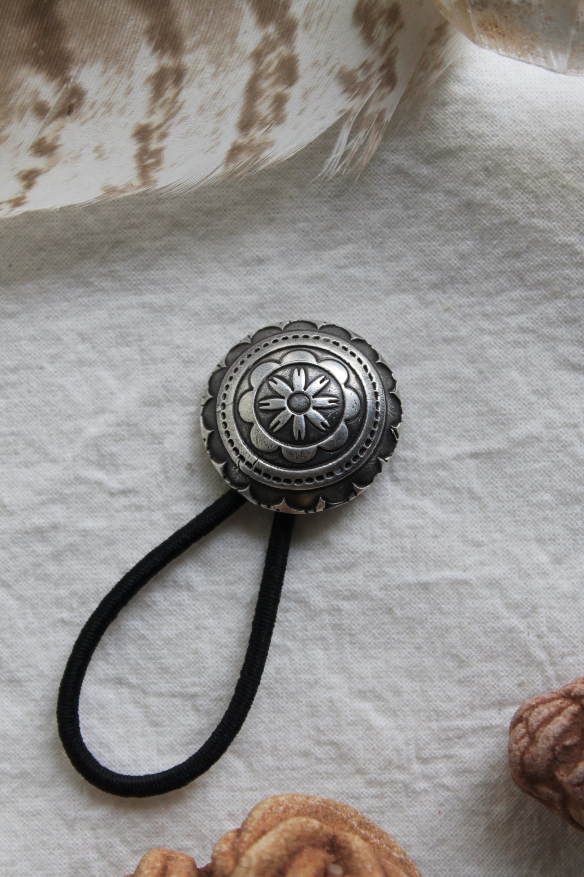 Fine silver handcrafted floral hair concho. Perfect little addition to dress up ponytails, braids or half up-dos. Jewelry is polished to a satin finish. Hair Tie not included.