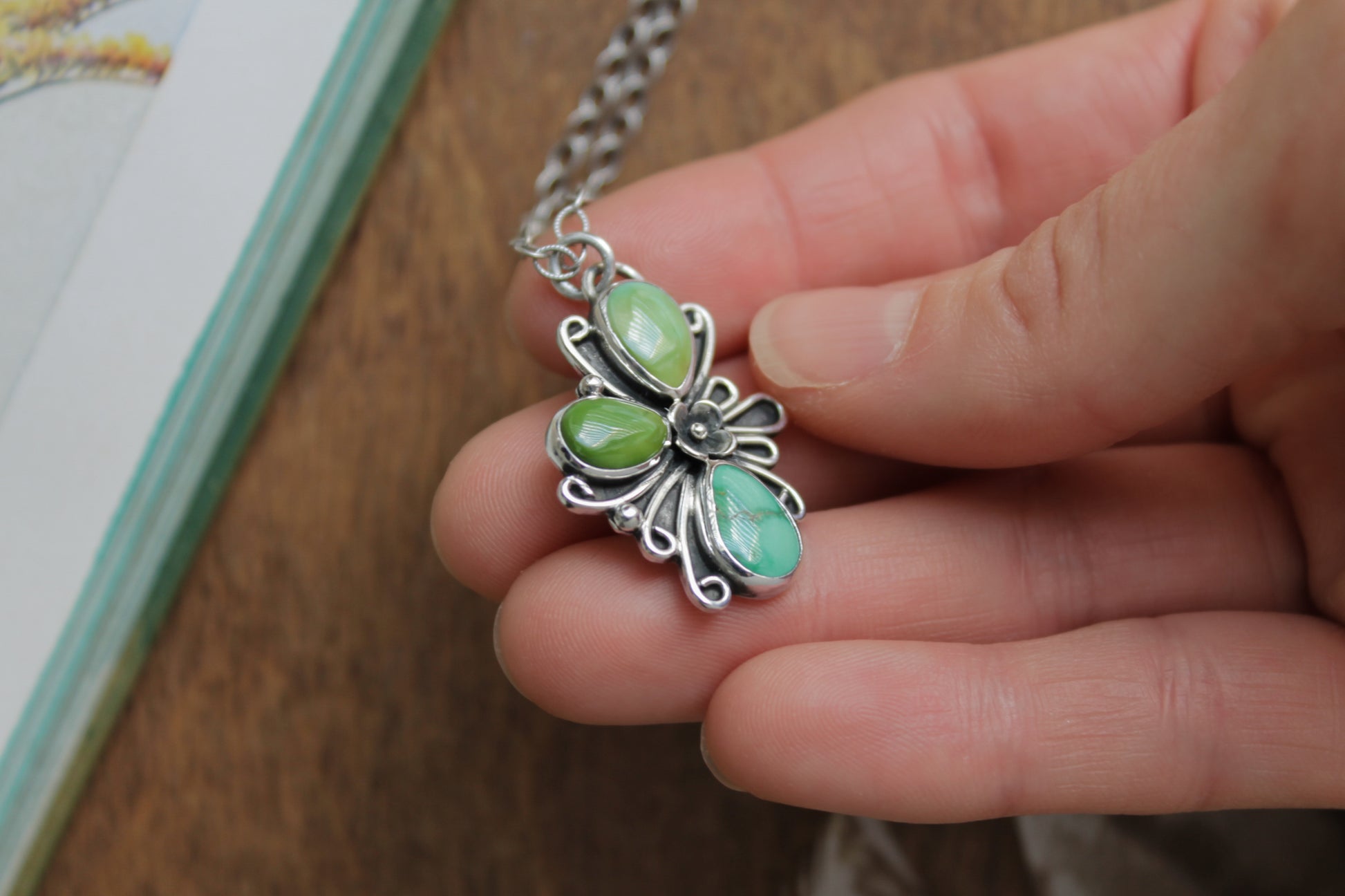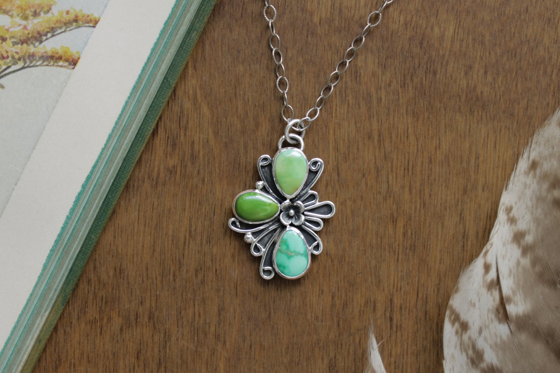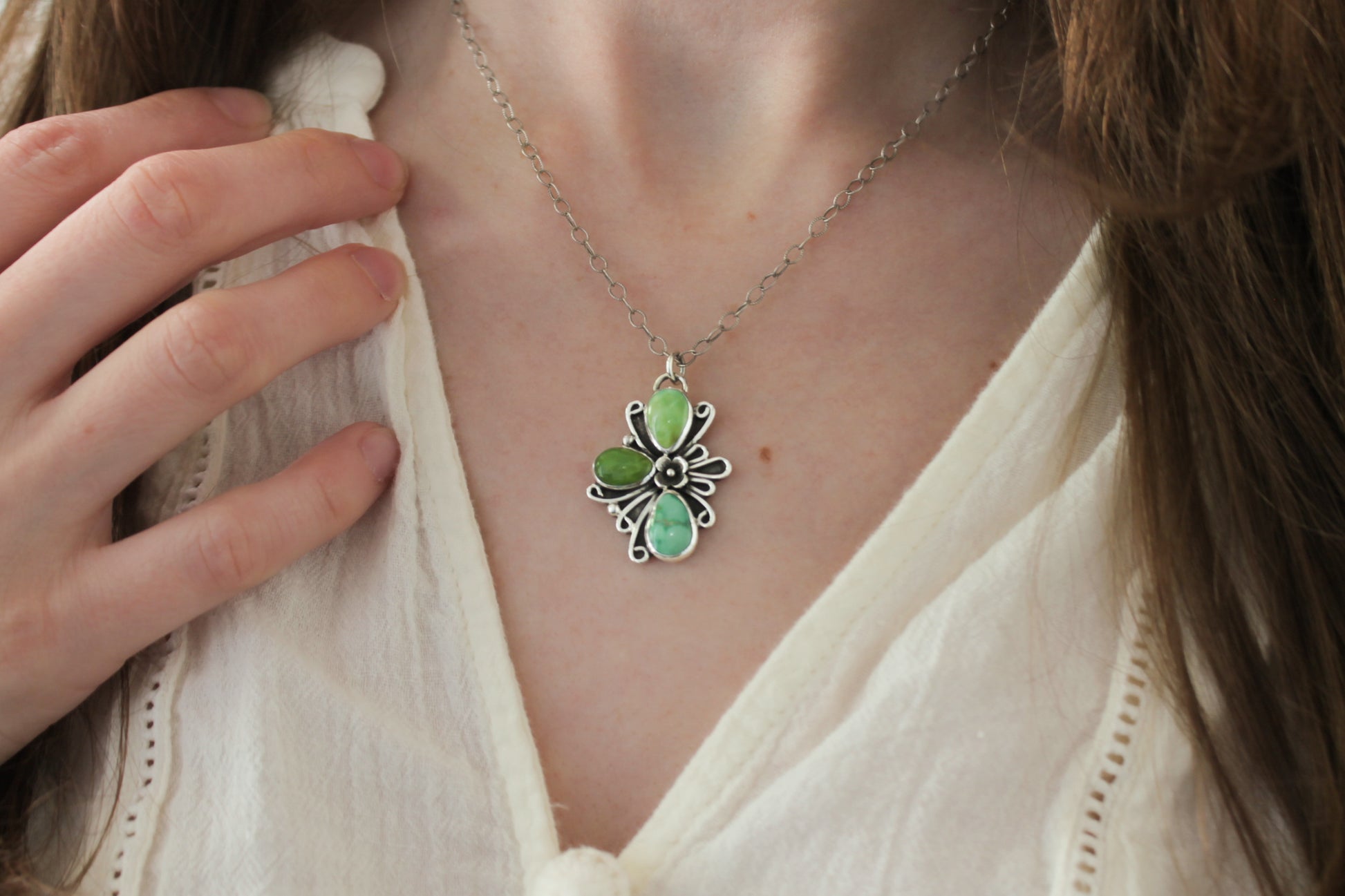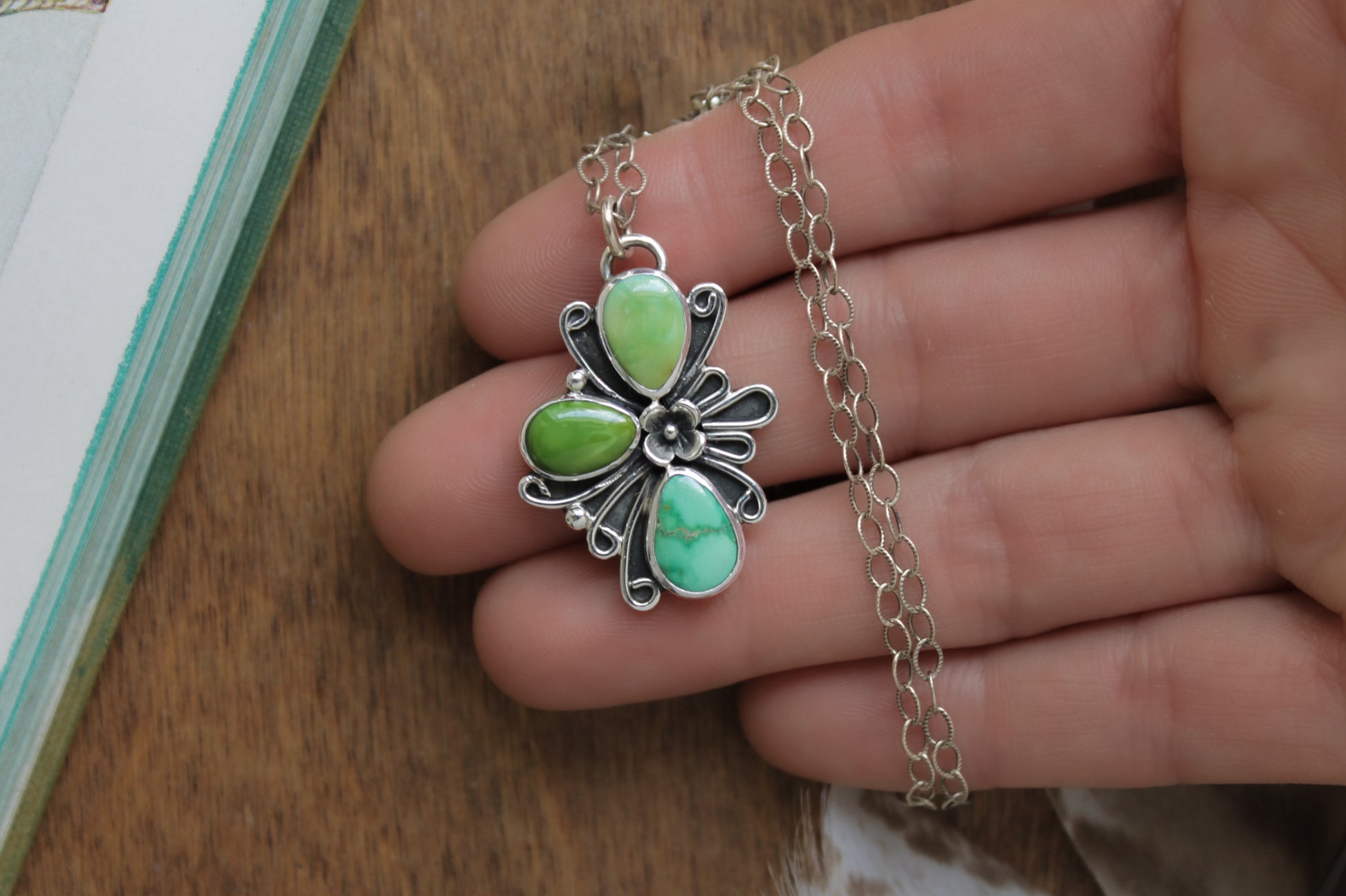 With a nod to vintage charm and nature’s grace, the Garden Song Turquoise Statement Necklace brings together a one-of-a-kind turquoise cluster in an heirloom-worthy design. Each carefully selected gemstone—vibrant blues and rich greens from Emerald Valley turquoise —blends beautifully to create a harmonious color palette. This unique arrangement is encircled with sterling silver details, including delicate fleur and floral accents, each thoughtfully handcrafted to elevate the natural beauty of the gemstones.