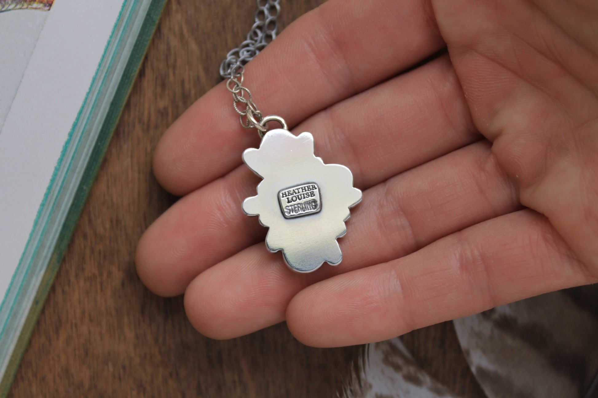 It’s the kind of statement piece that feels both bold and tender, inviting memories to be made with each wear. With its satin polish and intricate embellishments, this necklace serves as a keepsake piece—one you’ll reach for whenever you want to carry a bit of nature’s beauty with you, no matter the season. This pendant hangs from a patterned and oxidized adjustable 16"-18" sterling silver chain. All jump rings are soldered closed for safe keeping. All components including clasp are sterling silver. Jewelry is polished to a satin finish.