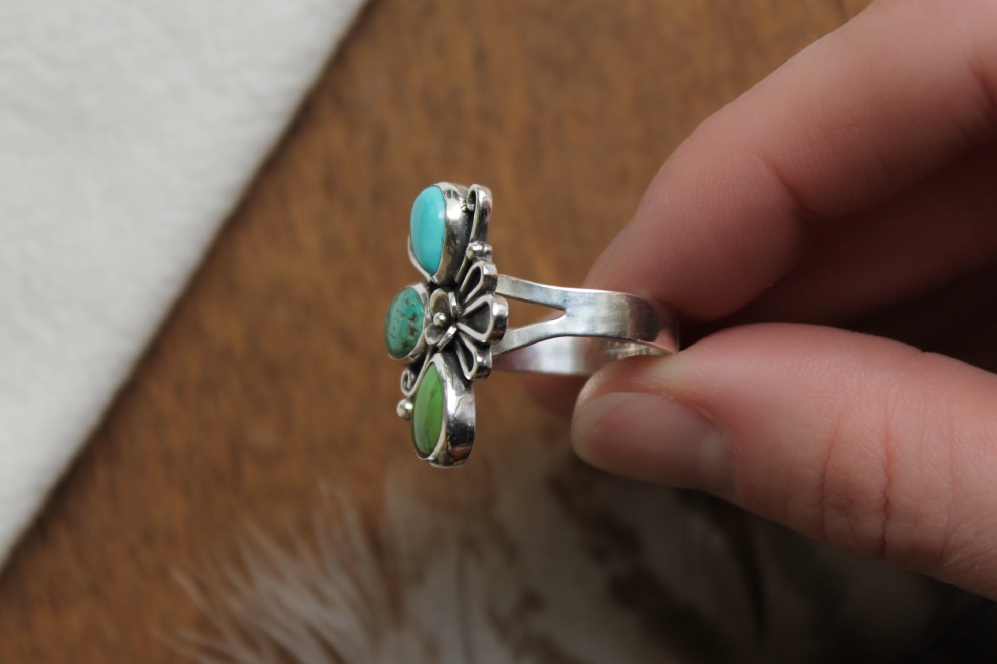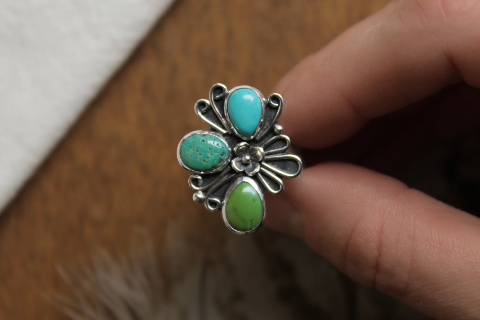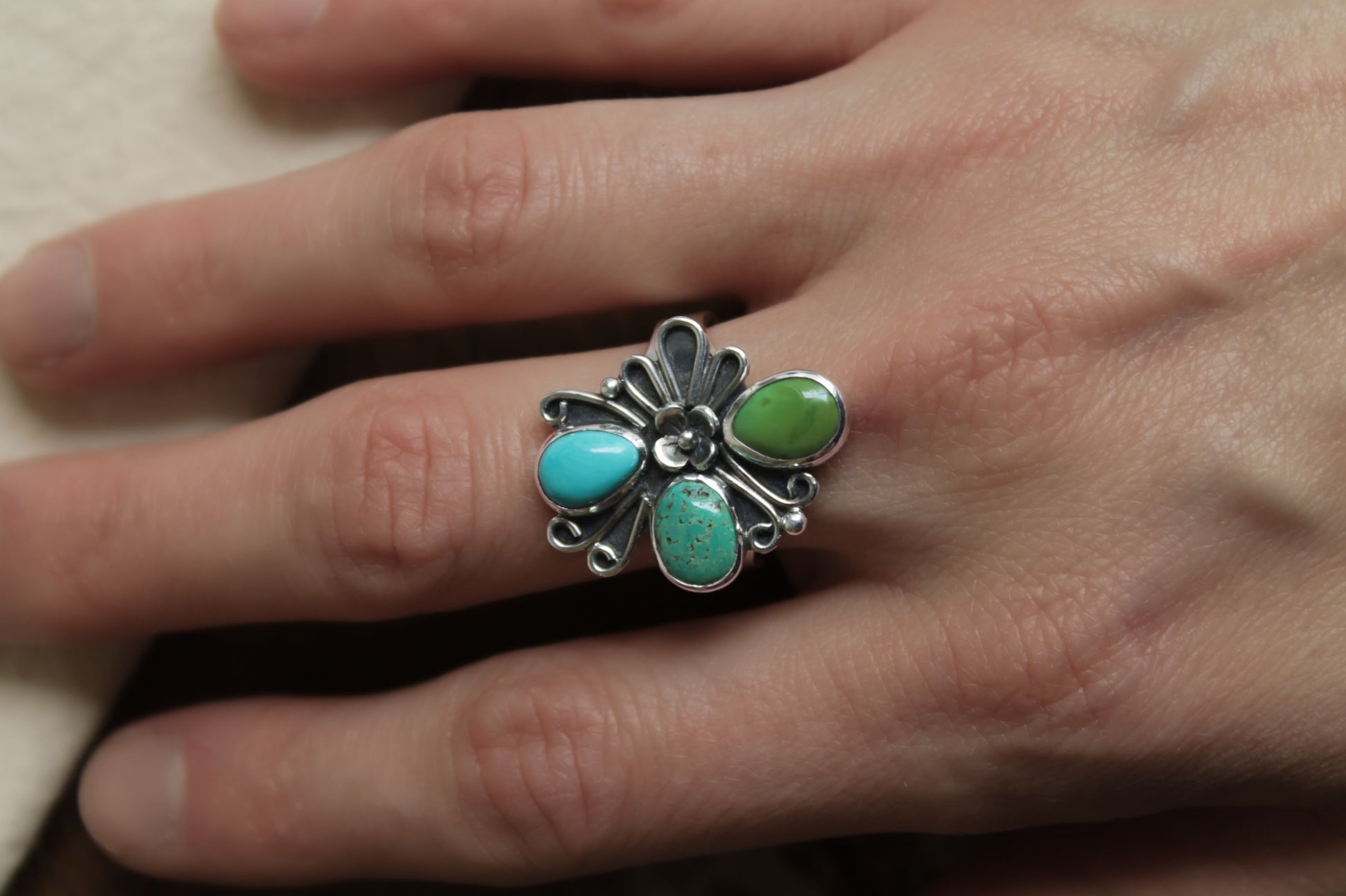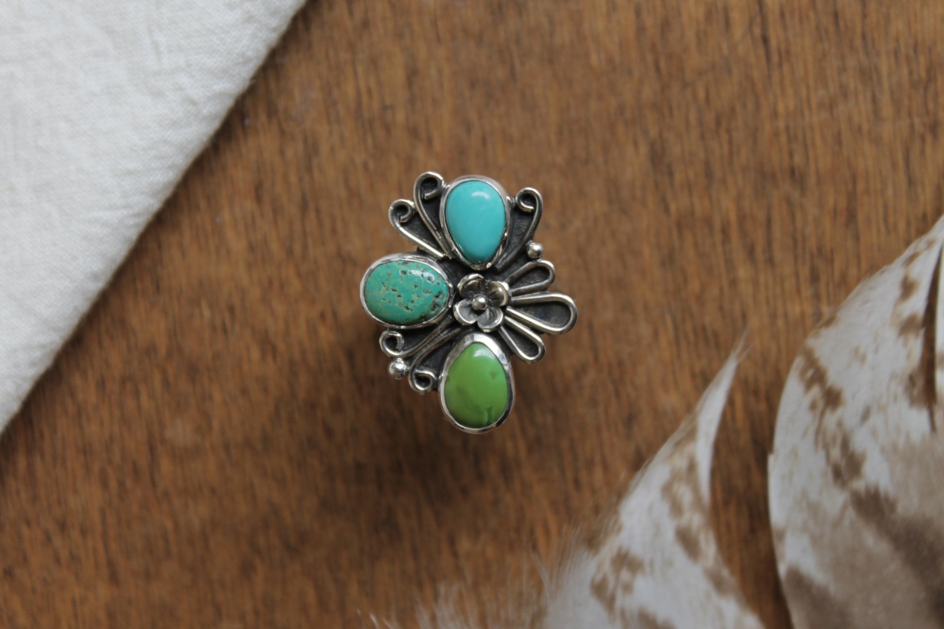With a nod to vintage charm and nature’s grace, the Garden Song Turquoise Statement Ring brings together a one-of-a-kind turquoise cluster in an heirloom-worthy design. Each carefully selected gemstone—vibrant blues from Royston turquoise and rich greens from Emerald Valley turquoise —blends beautifully to create a harmonious color palette. This unique arrangement is encircled with sterling silver details, including delicate fleur and floral accents, each thoughtfully handcrafted to elevate the natural beauty of the gemstones.