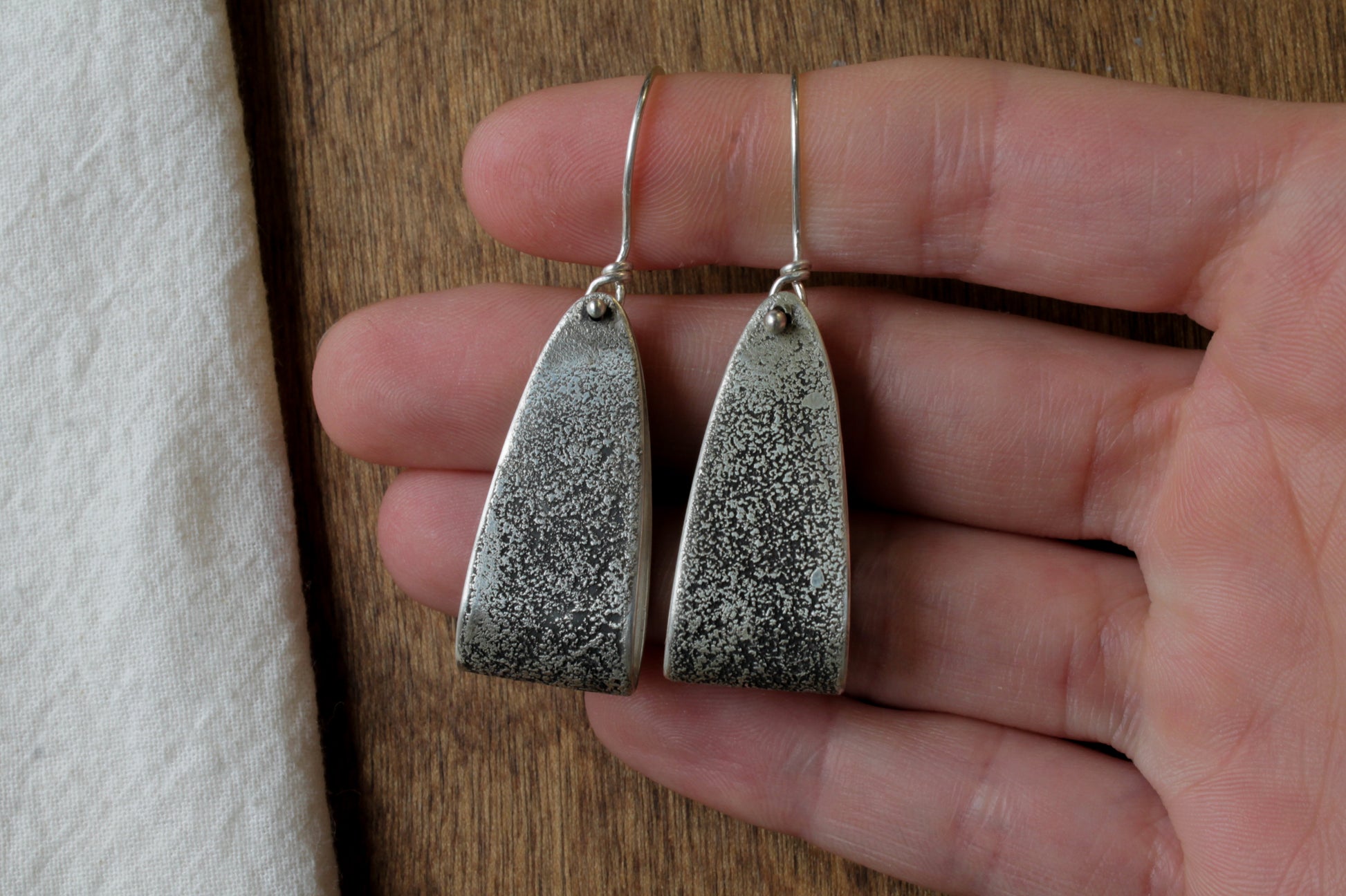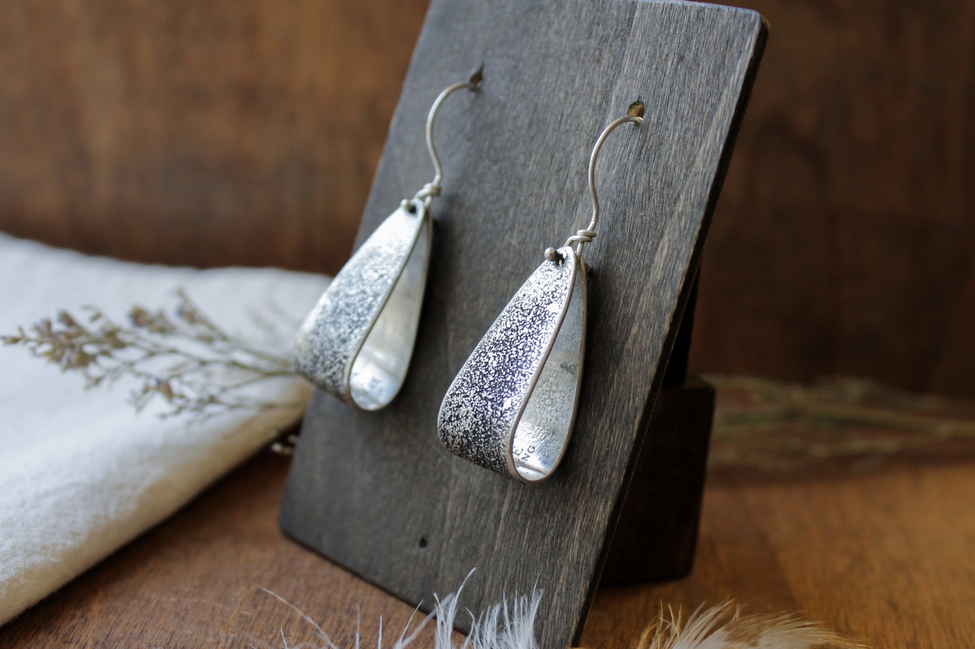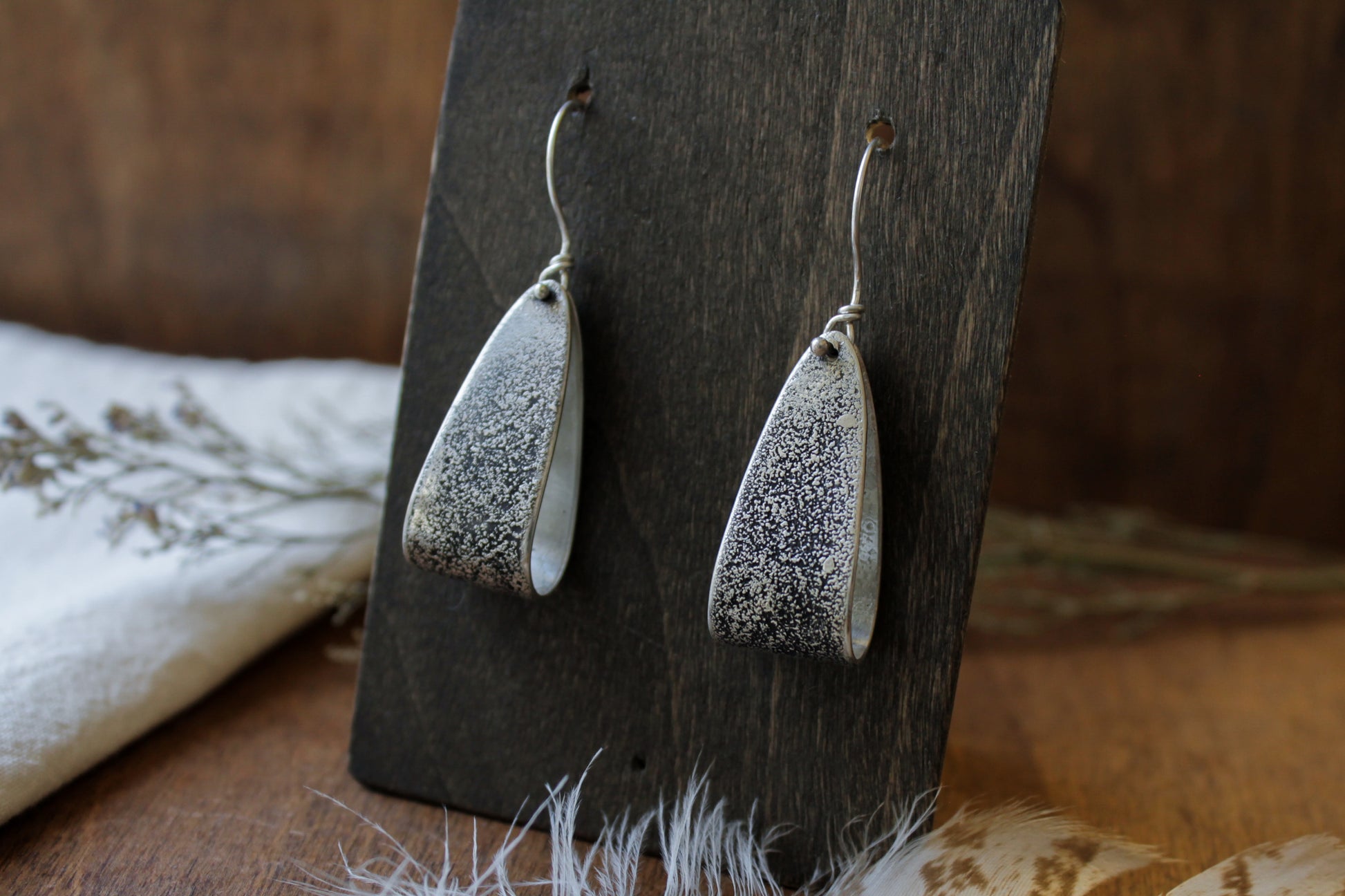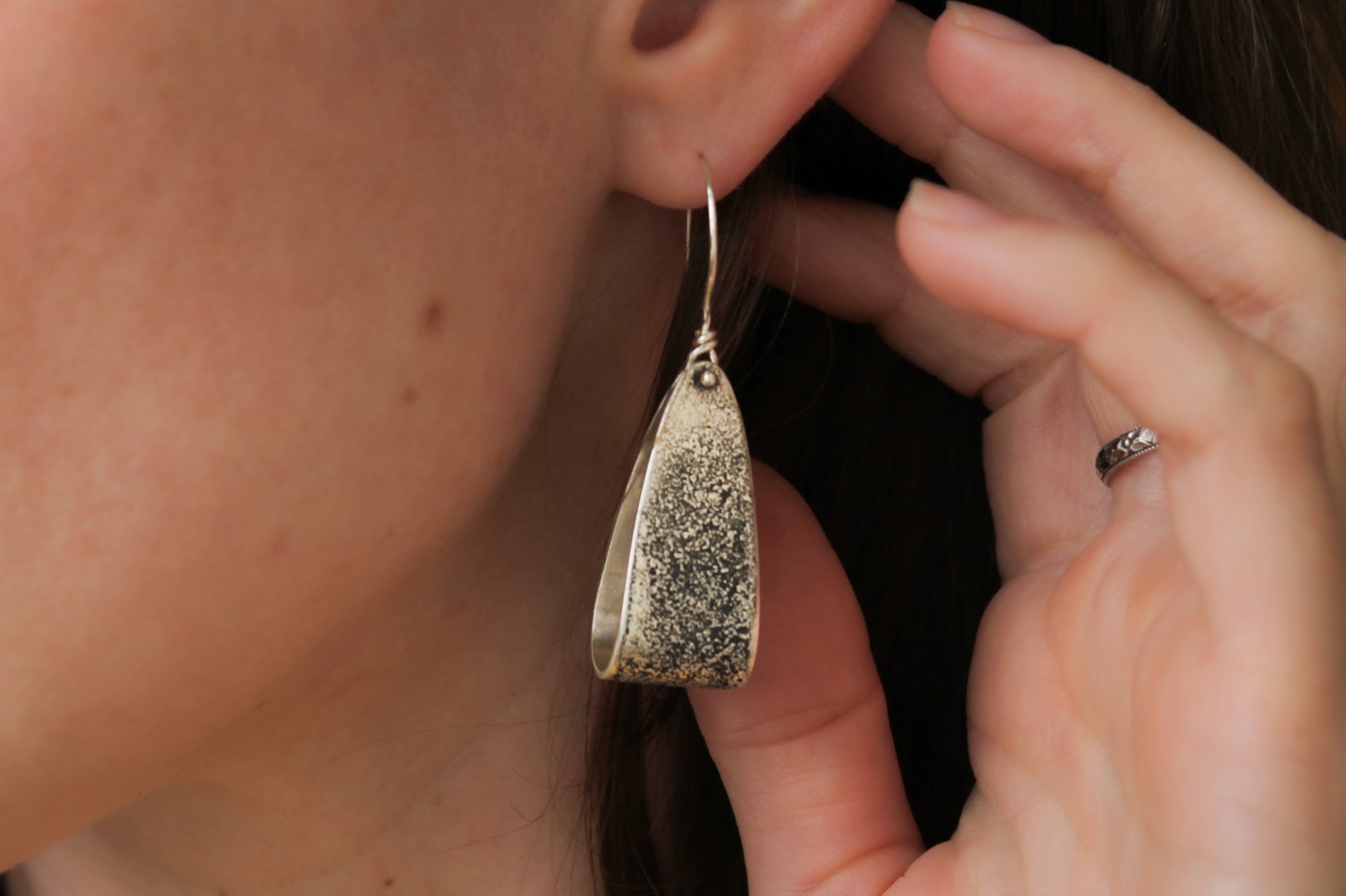 Add a a subtle dash of Western charm to any outfit with the Palomino Earrings. These elegant dangle earrings feature a silver dust textured ribbon design, reminiscent of horse-riding stirrups. Perfect for adding a classic and unique touch to your look, these earrings are a must-have for anyone looking to make a statement. Earrings hang from handmade sterling silver french hooks. Jewelry is polished to a satin finish.