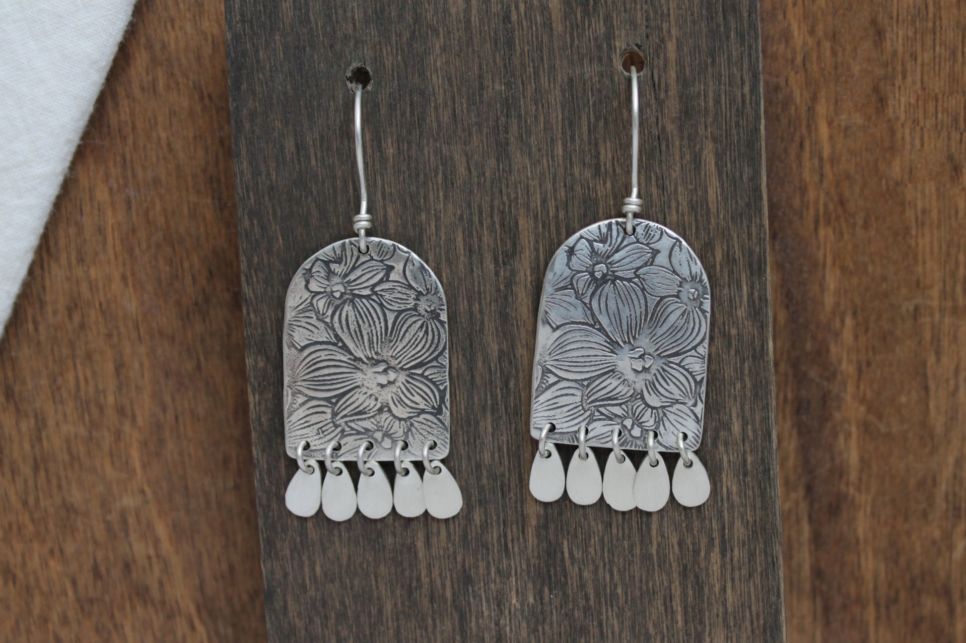 These sterling silver dangle earrings showcase a delicate flower design complemented by charming dangling fringe charm accents, creating a timeless look ideal for everyday wear. The intricate floral embossed details add a gentle elegance to any ensemble. Perfect for those who appreciate effortless style with thoughtful touches, these earrings hang from handmade sterling silver French hooks and feature a smooth satin finish.