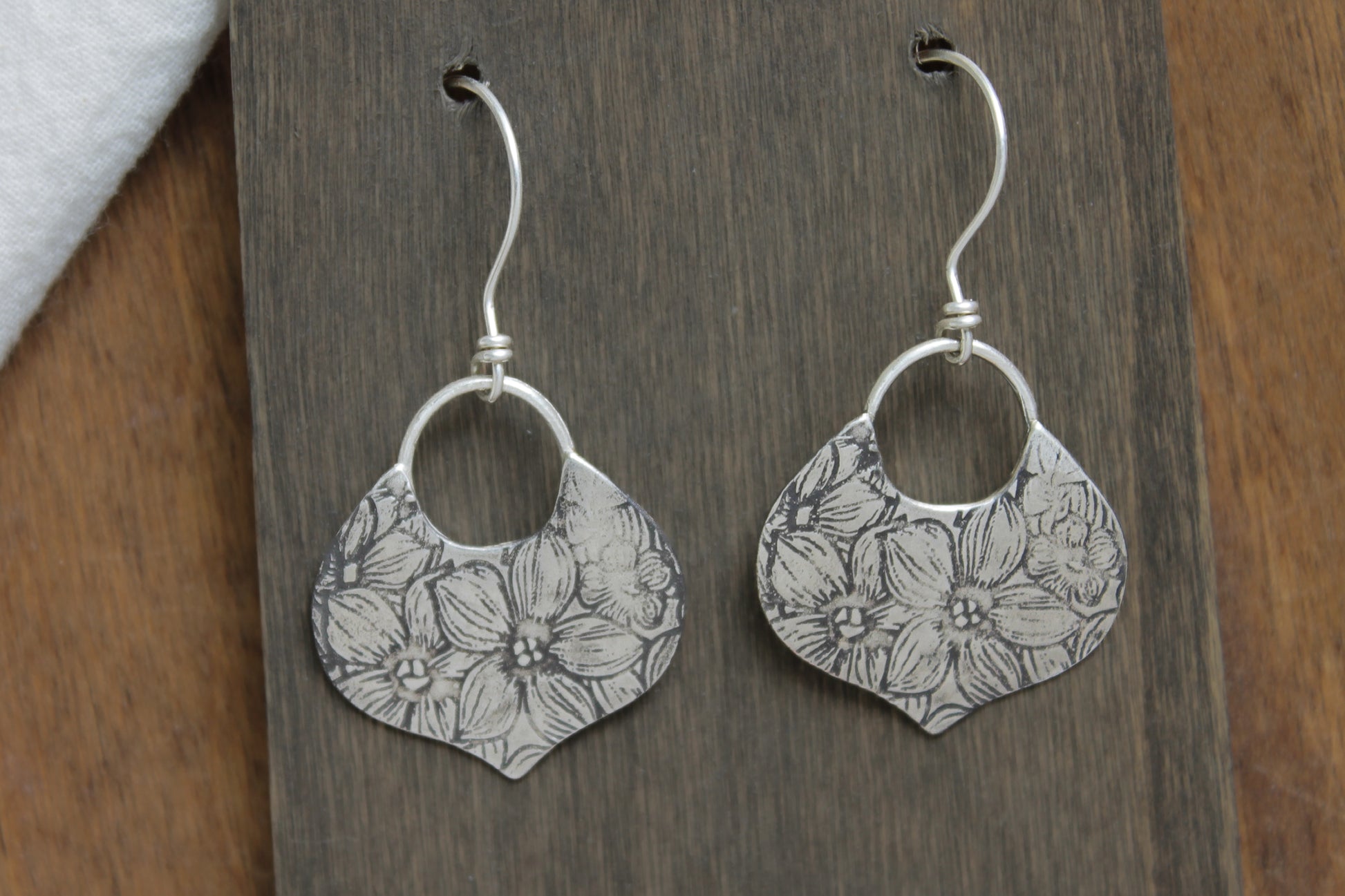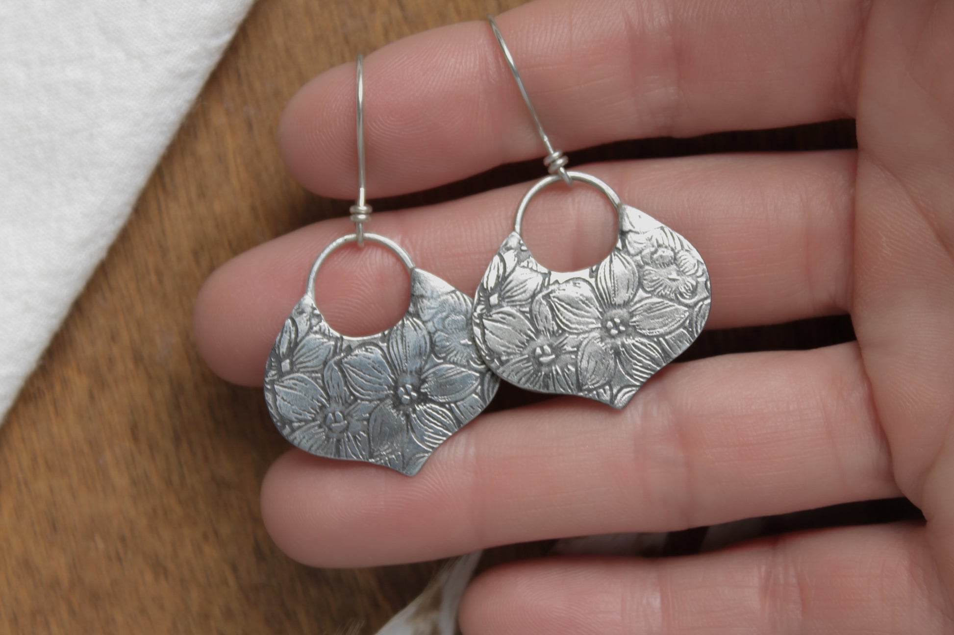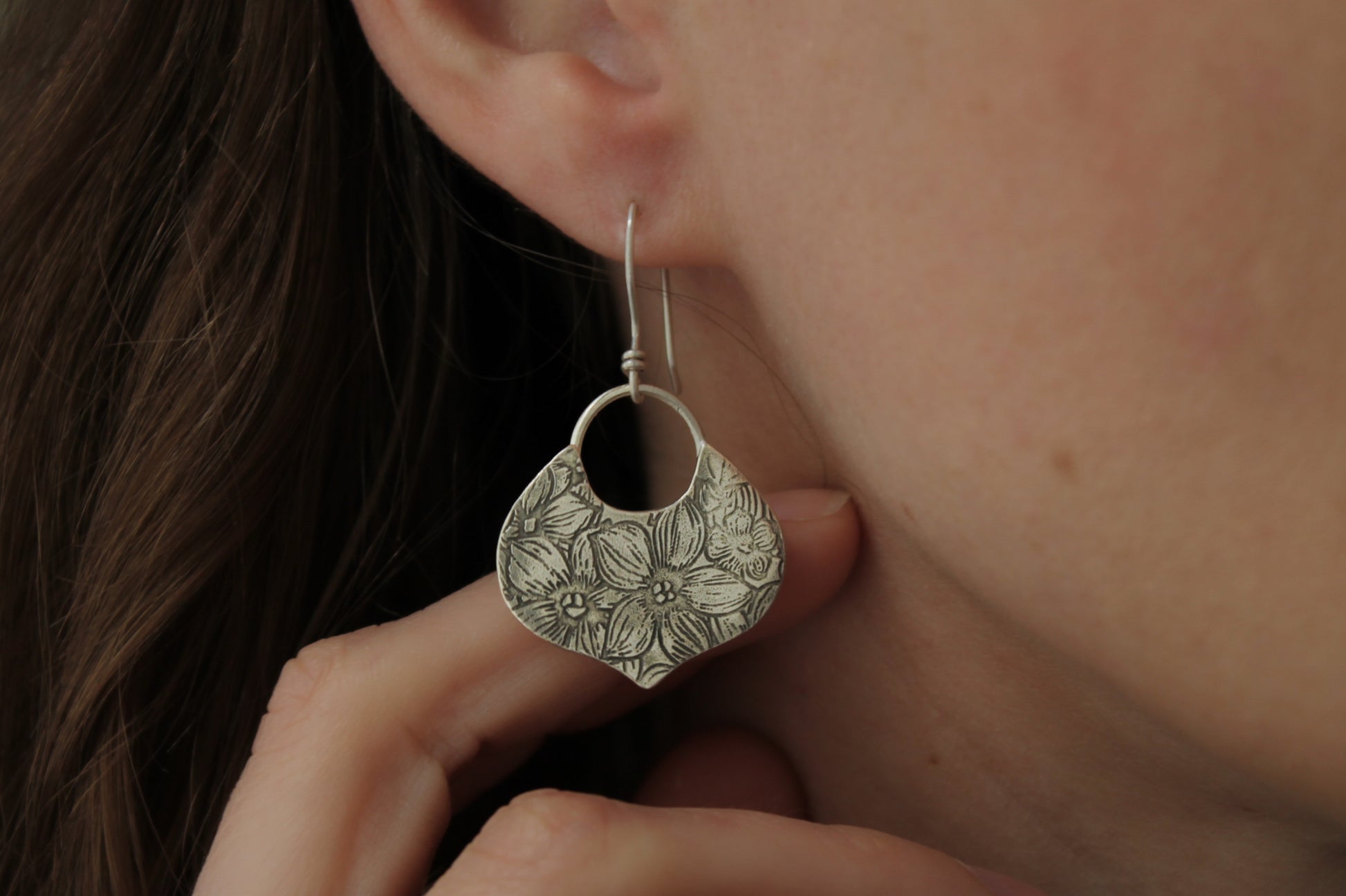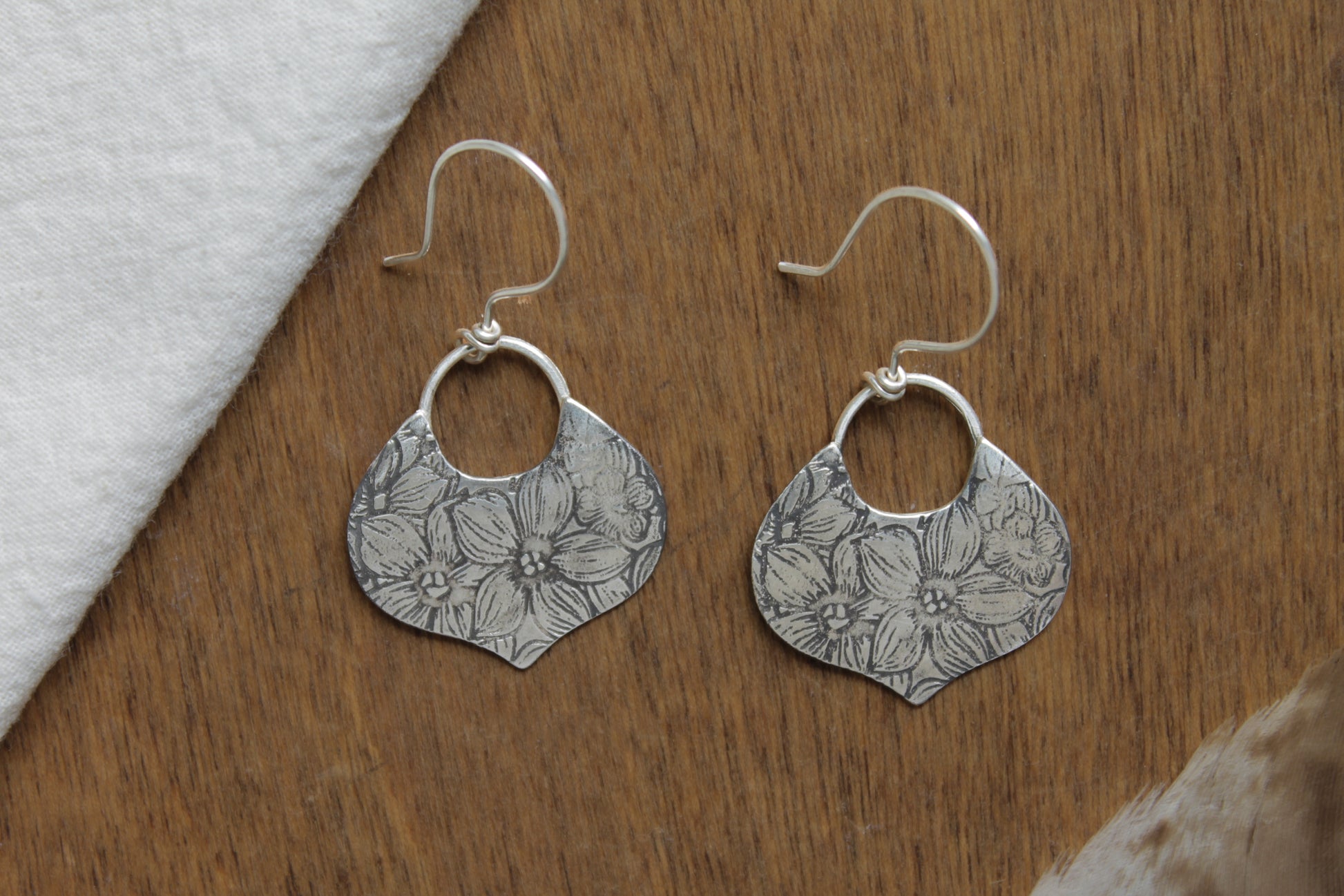These floral embossed sterling silver dangle earrings offer a delicate, timeless look perfect for everyday wear. Their lightweight design ensures they will stay comfortable all-day, while the detailed pressed flower pattern adds a subtle touch of nature-inspired elegance to any outfit. Ideal for those seeking effortless style with meaningful details.