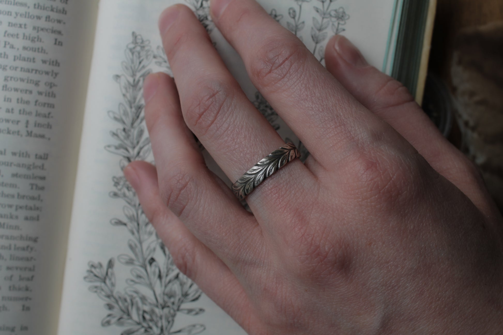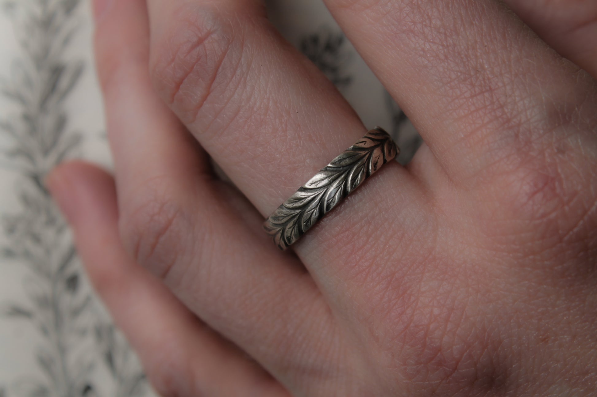 This stunning handmade ring features an intricately detailed laurel pattern, crafted in sterling silver. Its subtle design is perfect for everyday wear and will delight nature lovers. Jewelry is polished to a satin finish